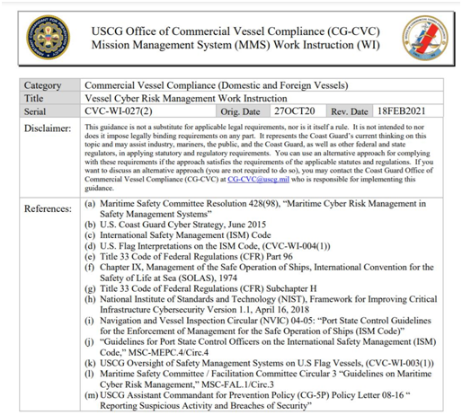 美国海岸警备队USCG发布了船舶网络风险管理指导(Vessel Cyber Risk Management Work Instrument)的文件,编号为:CVC-WI-027,该文件是一个操作程序,告知PSCO怎么检查、怎么详细检查、怎么滞留船舶。