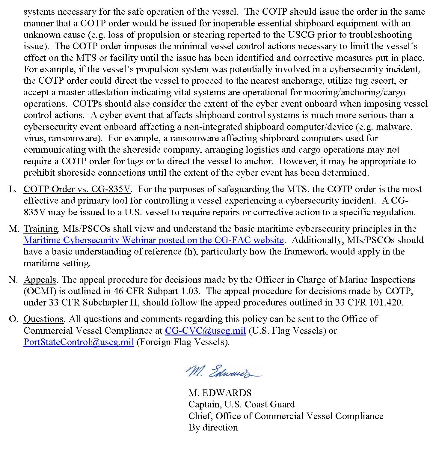 USCG提醒悬挂外国国旗的船舶经营人,如果他们到达美国港口没有符合所需的(尽管非常基本的)网络安全/网络环境规定,将面临船舶被扣押的风险,或至少需要进行快速修复。文件中有迹象表明,网络安全将开始被视为海上适航的基本条件。很明显,USCG并不关心船舶悬挂哪一国旗帜—要么是符合要求,要么是有缺陷需要修复,否则这艘船就会被扣押。